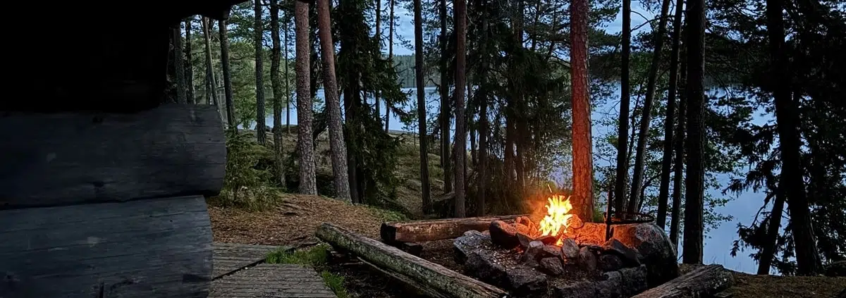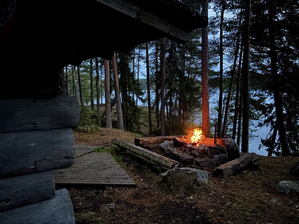Tutkailin Kapteeninkalliota lisää. Niemennokasta avautui kaunis näkymä Pääjärven selälle, ja rannasta löytyi toinen tulipaikka sekä uimapaikka. Kun lopulta löysin etukäteen varaamani rantasaunan, olin sen arkkitehtuurista kuin puulla päähän lyöty. Sauna oli louhittu puoliksi kallion sisään, ja se sijaitsi lähes vesirajassa kiinni. Se oli kuin maahisen pesä. Täällä heittäisin myöhemmin illalla mukavat löylyt.