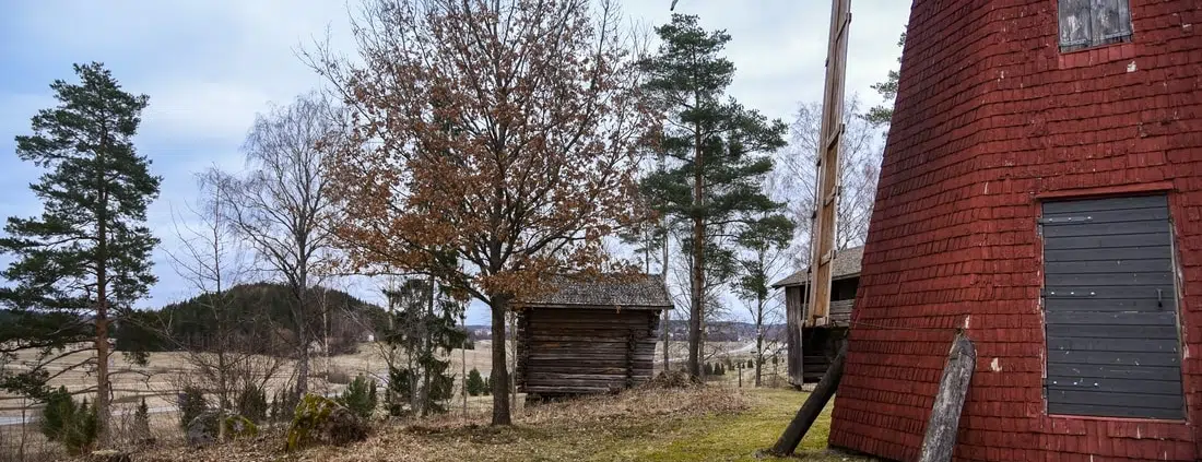 Tuulimyllyn jälkeen huomio kiinnittyy ympäröivään maisemaan sekä pihan muihin rakennuksiin.
