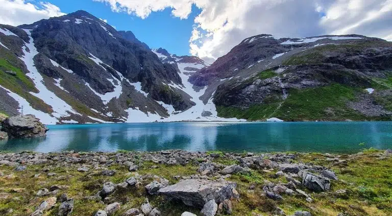 Loppumatkalla polku häviää kivien ja varvikon sekaan. Loikimme epätasaisessa maastossa Ut i Nord -postilaatikolle, joka onkin tyhjä. Ei vieraskirjaa, mutta eipä täällä juuri ihmisiäkään ole. Ei ketään muuta kuin me. Syömme hitaasti eväitämme ja istumme katselemassa ihmeellistä maisemaa ja väriään jatkuvasti pilvien mukaan muuttavaa järveä. Kågtindbreen-jäätikön sulamisvedet valuvat järveen monesta uomasta ja putouksesta.