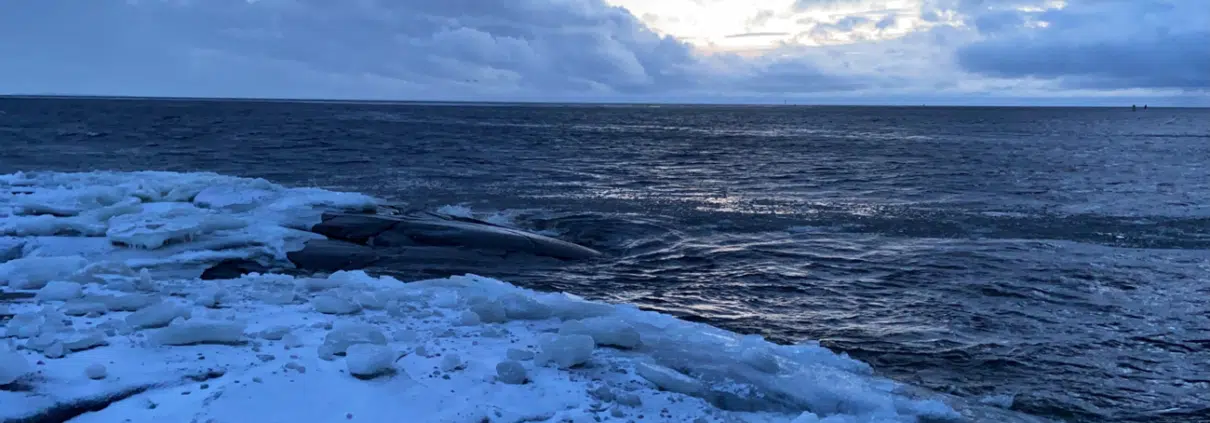 Edessä siintävää merimaisemaa halkoo siniharmaa seinämä, ja on vaikeaa erottaa, mistä alkaa vedenpinta, mistä puolestaan jylhät ja paksut pilvimassat. Majakan edustan rantakalliot peittyvät liukkaan jään ja lumikerroksen alle, ja pystyssä pysyäkseen askeleensa saa valita todella tarkkaan. Harmittelen kenkiäni, joiden pohjasta ei tälläkään kertaa löydy nastoja. Uskaltaudun kuitenkin lähemmäksi uloimpia kallioita.