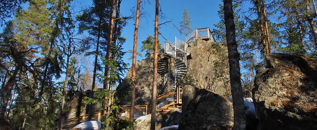 - Ilveskivi keväthankien aikaan. Uudet portaat helpottavat huomattavasti kivelle nousua.