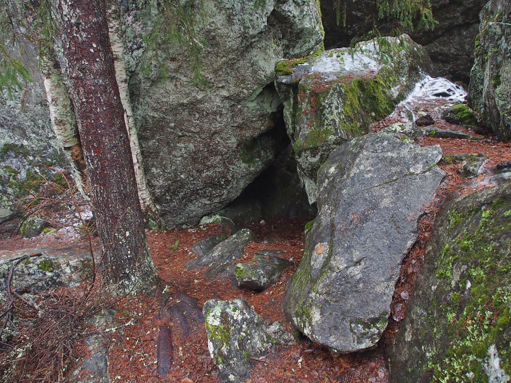 - Ilveskiven pääluolan sisäänkäynti on vaatimaton aukko lohkareiden välissä.