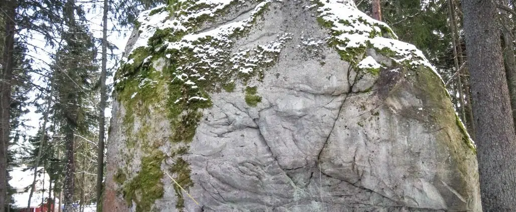 Aivan ensimmäiseksi huomautus! Lohkareen suuri koko ei oikein mitenkään pääse oikeuksiinsa näissä kuvissa, joihin en onnistunut saamaan ihmistä mittatikuksi. Kiven etelänpuoleinen, Sommarbon polulle näkyvä syrjä on kaikkein korkein ja todella tasaiseksi pinnaksi lohjennut. Siitä ei varmaan kiipeä ylös taitavinkaan vapaakiipeilijä, paitsi käyttämällä hyväkseen lounaiskulmalla kasvavia puita. Niistä aivan kiven pinnassa kiinni oleva raita on katkennut ylhäältä ja näyttää kuolleelta.