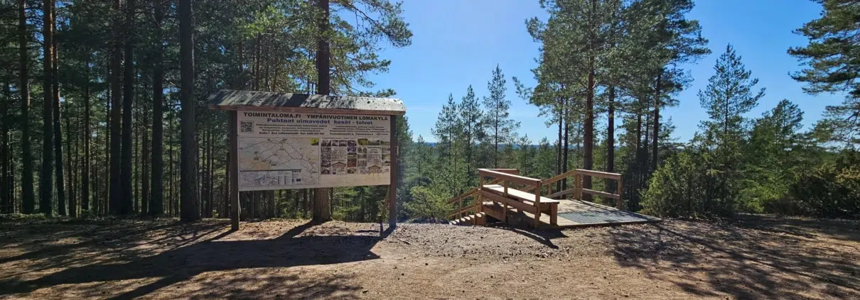 Kaksi kilometria kävelyä takana. Hetken päästä ollaan harjun laella. Risteyskohdissa on huomattava määrä opasteita välimatkoineen. Näköalalaavulle tästä on matkaa noin 400 metriä.