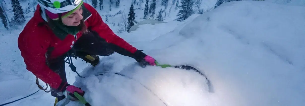Viimeisenä kiipeilypäivänä oli vuorossa Ruskean Virran putous, jolla on korkeutta 60 metriä. Nyt alkoi jo pieni seikkailufiilis löytyä kävellessä otsalampun valossa polkua alas, talvista ja hämärää metsää pitkin laaksoon.