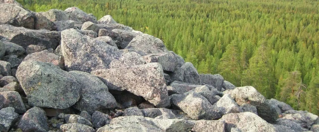 Mutta mitähän täällä oli aikoinaan tapahtunut? Melkoisten luonnonvoimien on täytynyt mellastaa vaaran rinteessä, kun tuollainen lohkarepelto on saatu aikaiseksi.