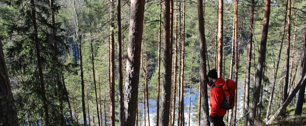 Tauon jälkeen päätimme oikaista kivipellon vierestä ylös. Rinteen kaikki ohuet haavat oli järsitty poikki. Näytti majavien työltä. Rinteen päälle päästyä aloimme katsomaan missä vanha rajaristi on. Olin lukenut siitä yhden jutun aiemmin, mutta en muistanut sen löytämiseksi annettuja neuvoja.