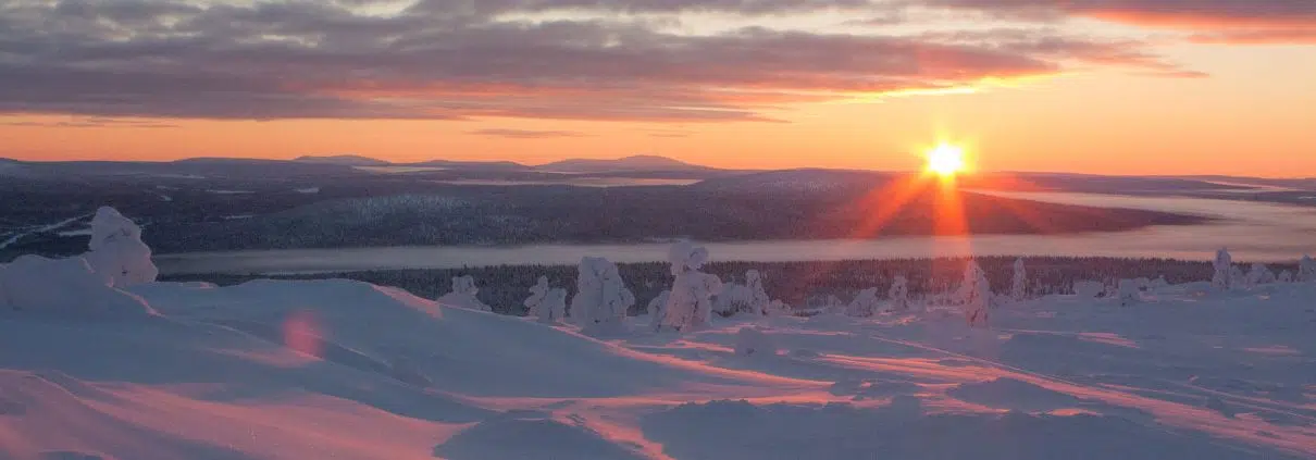 Aurinko ilmoitti olemassaolostaan maalaten taivaanrannan haalean oranssiksi Levin suunnalla. Pallas oli aluksi varjopuolella ja sai valoa osakseen vasta myöhemmin.