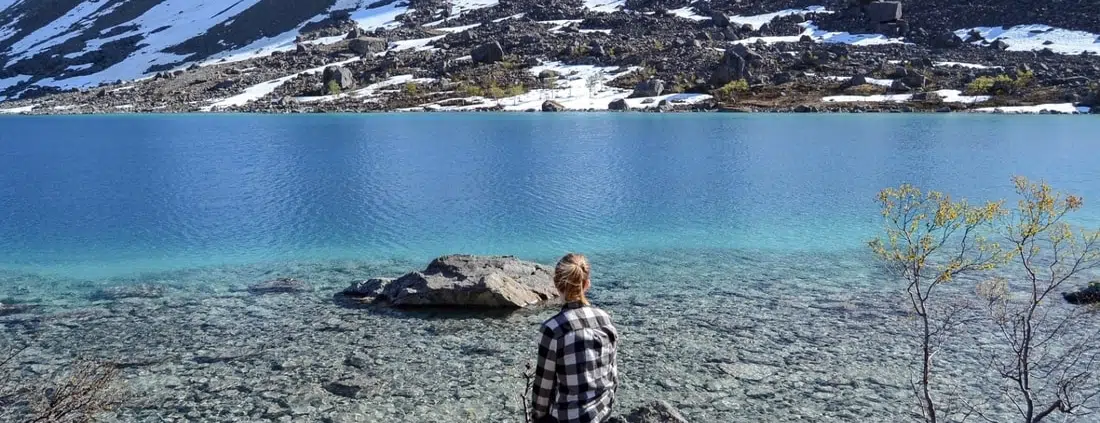 Blåisvatnetin reitti kuuluu Lyngsalpanin maisemansuojelualueeseen, joten pidimme koirat kiinni koko matkan emmekä poikenneet merkityltä reitiltä. Söimme retkieväät eli kasvispitsapalaset ja juotavat jogurtit järven rannalla ja annoimme koirien levähtää kunnolla ennen kuin palasimme samaa reittiä pitkin takaisin autolle.