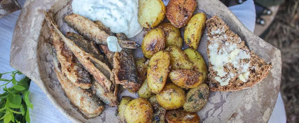 - Paistetut uudet perunat, paistetut muikut ja kesäsoossi, ruisleipää