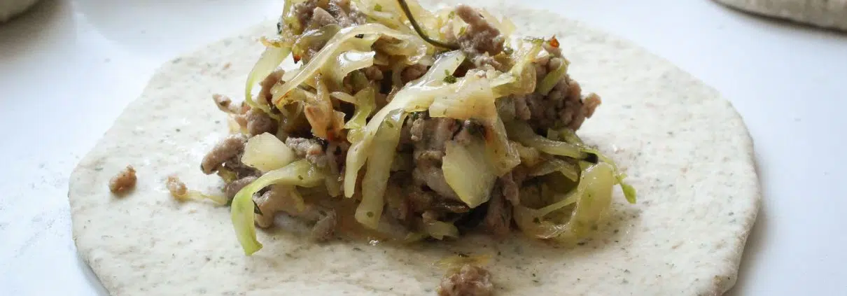 Olen laittanut täytteeseen usein pelkkää sipulia ja kaalia, mutta toisinaan olen lisännyt joukkoon myös juureskuutioita, soijarouhetta, jauhelihaa, nokkosta tai riisiä. Talvikelissä kehoa lämmittää ihanasti reilu tujaus chiliä.