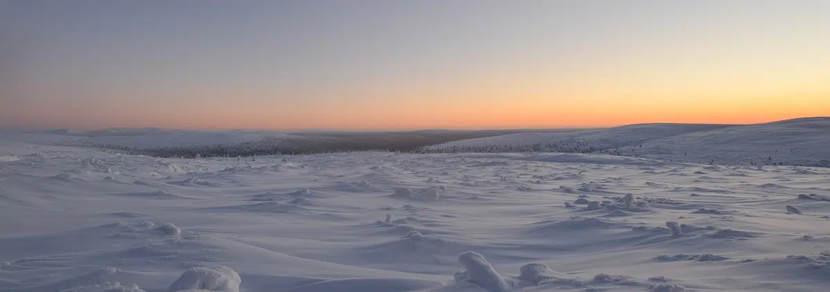 Erotin lumesta hieman kelkan jälkeä ja päätin uskaltaa lähteä nousemaan tunturin rinnettä ylös. Aurinko yritti nousta Nattasten takaa näkyviin luoden taivaalle mitä uskomattomampia värejä. Niistä lumoutuneena hiihtelin vähän missä sattuu ja löysin itseni syvänteestä, josta oli hankala nousta ylös. Tykkylumipuut seisoivat hiljaa paikoillaan, olin hetkessä päässyt ruuhkaiselta hiihtouralta täyteen rauhaan erämaahan.