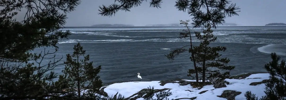Saapuessamme rannalle saatoimme huomata sään olevan muuttumassa. Kauniit rantakalliot lumosivat – elämässäni on ollut silokalliopuutostila viime vuosina – mutta huomio kiinnittyi myös horisonttiin, jossa lumisaderintama teki tuloaan hyvin näyttävästi.