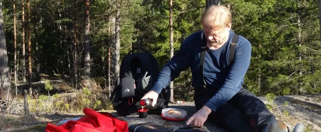 Siitä, miten eväät ja kahvit aina maistuvat kaikkein parhaimmille ulkona luonnossa. Miten ne lataavat uutta voimaa mahdollisesti vaikka jo hiukan väsyneenkin kulkijan kehoon. Miten hienoa on rauhoittua aivan paikalleen katselemaan maisemia, ympäristöä ja luonnon elämää. Hiljaa paikallaan ollessa näkee ja kuulee niin valtavasti paljon enemmin, kuin vaikka rauhallisesti kävellessäänkin. Ja jollei ole liikkeellä yksin, evästauot ovat niitä kaikkein mukavimpia hetkiä ajatustenvaihtoon. Luonto, normielämästä poikkeavat paikat ja kokemukset sekä avarat näkymät hyvin usein vievät ihmisen ajatukset tuoreille laduille.