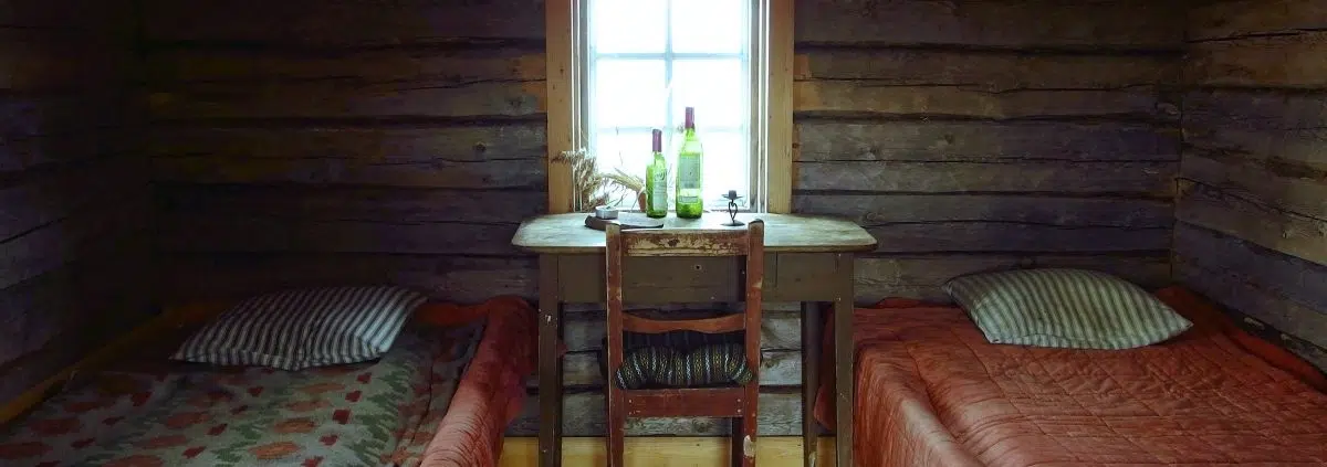 En edes malttanut rannalle päästyäni riisua melontaliivejä, vaan malttamattomana kipitin ensimmäisen tuvan luokse. Se oli lukitsematon! Avasin jännittyneenä oven haan ja silmieni eteen avautui ällistyttävän siisti huone, jonka sisus oli selvästi laudoitettu hiljattain. Tuvassa oli kerrossänky patjoineen. Kun kokeilin patjaa, huomasin, että se oli täytetty perinteiseen tapaan oljilla. Siinä kelpaisi kyllä nukkua! Huoneen seinällä oleva kyltti toivotti tervetulleeksi vierailijan, vaikka itse saari olikin yksityisomistuksessa. Kyltissä myös ohjeistettiin, että lintujen pesimäaikaan saa ainoastaan liikkua kalamajojen tuntumassa. Ja kuten autiotuvan sääntöihin kuuluu: tupa on jätettävä siistiin kuntoon.