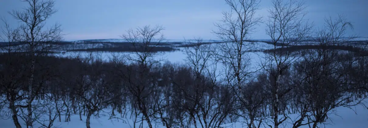 Illan hämärä värjäsi jo vaivaiskoivuja siniseksi, kun hiihdimme läpi Kaldoaivin tuntureiden eräälle tuvalle.