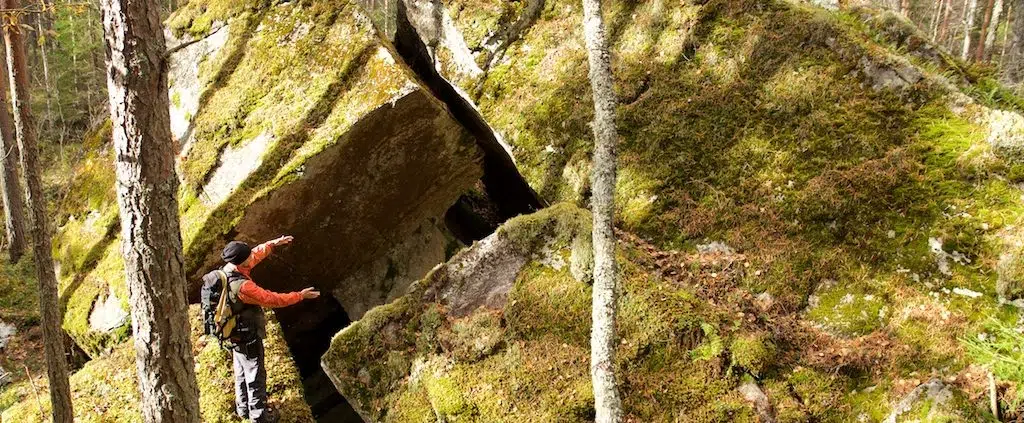 Märkä jäkälämatto luistaa irrotessaan jalkojeni alta. Arviointivirhe voi olla kohtalokasta, koska iso ryminä jätti aikanaan paljon koloja ja yllättäviä kielekkeitä. Silmäni näkevät maassa vain sammalta ja lahonneita puunrunkoja. Yhtäkkiä seison kalliokielekkeellä, jota ennen on reilut kuusi metriä syvä loukko. Paikoin leveä, paikoin juuri jäniksen mentävä. Raon vastapuoli on pitkä kiemurteleva moniosainen kallioviipale. Ihastelen vaarallista paikkaa, kunnes peräännyn varovasti.