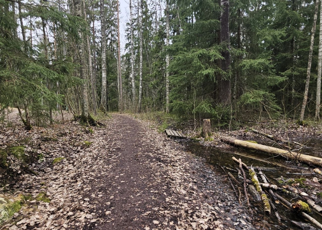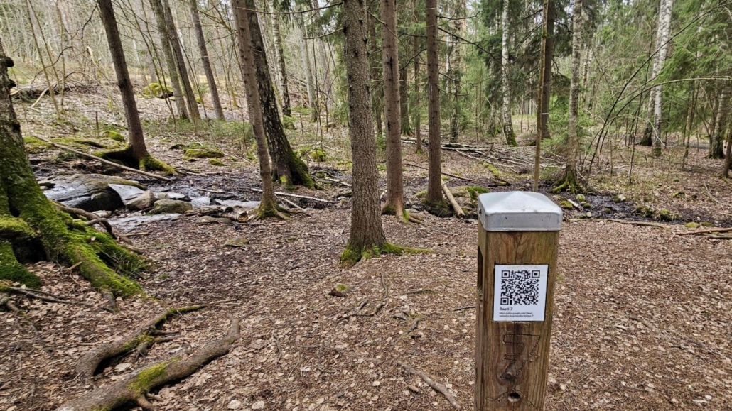 Puolentoista kilometrin jälkeen saavutaan sympaattisen puron äärelle. Rastin 7 aiheena on tietenkin ”Soliseva puro”. QR-koodin kautta avautuva sivu kertoo myös sen, että tänne ollaan suunniteltu koulun omaa istutusmetsää ja askeleita ottaessa tulee varoa pieniä puuntaimia.