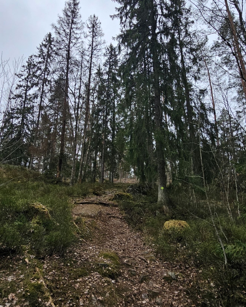 Ilmeisesti reitti alkaa tästä. Reitti vaikuttaa olevan merkitty keltaisilla maalimerkeillä ja se alkaa melko jyrkällä nousulla ensimmäiselle kalliolle. Ihmettelen, miksi Espoo mainostaa reittiä helpoksi – korkeuseroa on tosin vain parisenkymmentä metriä, mutta tämä nousu on kuitenkin kivikkoinen ja pahimmillaan melkoisen jyrkkä.