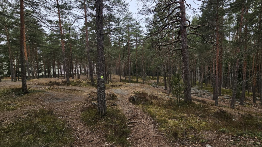 Reitin pohjoisin piste on Vanhan Sveinsintien lähistöllä. Omakotitalot siintävät kasvillisuuden läpi tähän aikaan vuodesta, kesällä asutusta tuskin huomannee.