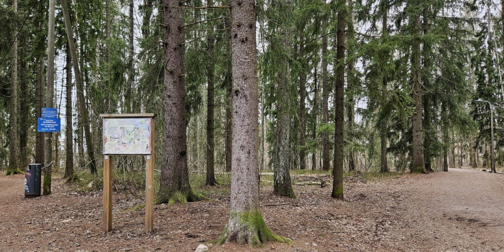 Puolisen kilometriä kävelty. Polku saapuu pienelle aukiolle, jossa reitti käväisee Karakallion kuntoradan tuntumassa. Tässä on luontopolun infotaulu.