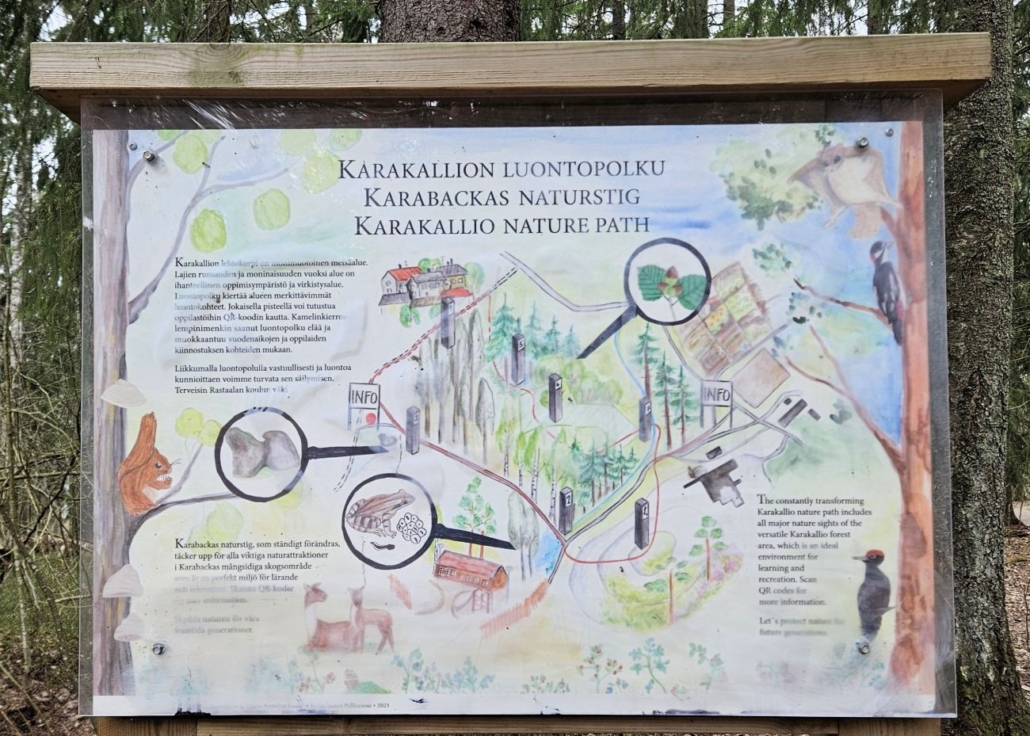 Joka tapauksessa taulu kertoo, että Karakallion luontopolku on tehty yhteistyössä Rastaalan koulun kanssa. Reittiä kutsutaan myös Kamelinkierrokseksi ja sitä muokataan vuodenaikojen mukaan.