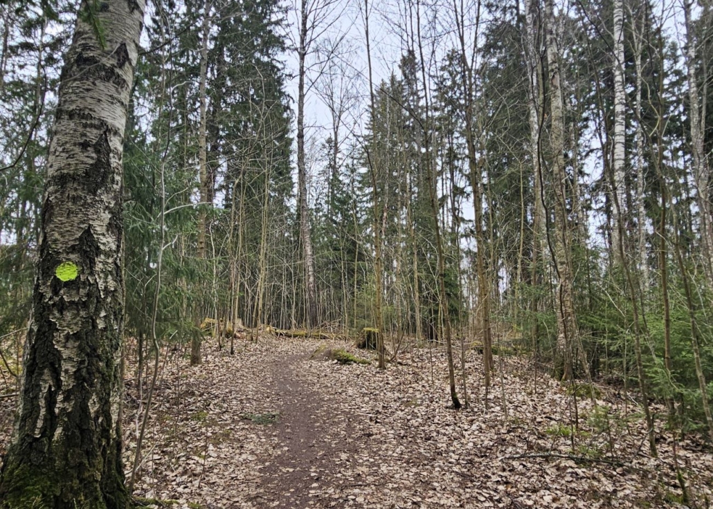 Polku laskeutuu mäeltä loivasti alas. Jouduin hetken miettimään oikeaa suuntaa ja vilkaisin karttaakin netistä. Kartassa tähän on merkitty ”Karakallio – Leppävaaran ulkoilureitti”. Leveämmän ulkoilureitin vieressä kulkee samansuuntaisesti hieman kapeampi polku, jonka varrelta löysin seuraavat keltaiset merkinnät.