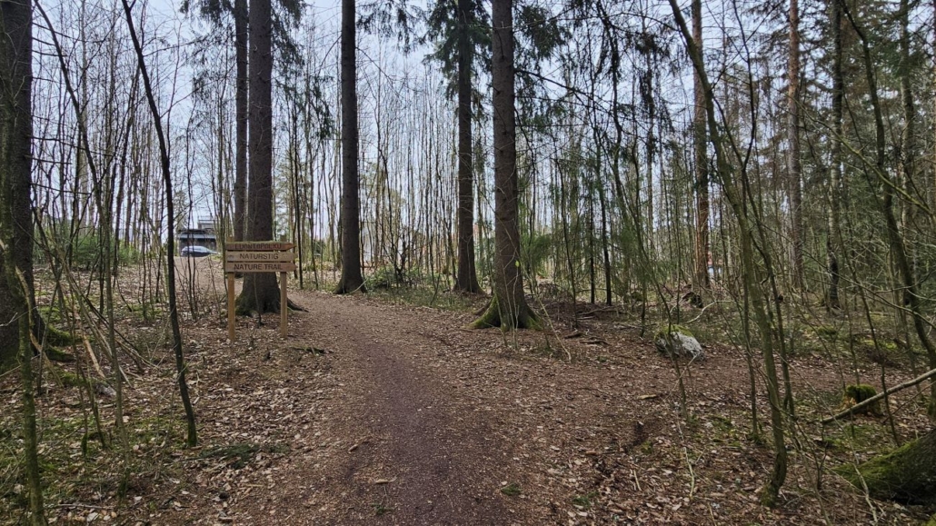Tästä reitti jatkuu lehtipuuvaltaiseen metsään. Tänne kannattaisi tulla hieman myöhemmin keväällä, näin huhtikuun alussa oli vielä harmaata.