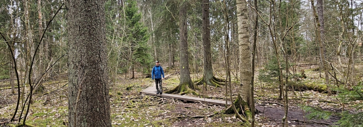 Kilometrin kohdalla ollaan reitin ainoalla lyhyellä pitkospuuosuudella. Täällä voi varmasti joinain keväinä olla kosteaa, tänä keväänä ei niinkään. Kuva blogin pääkuvana.
