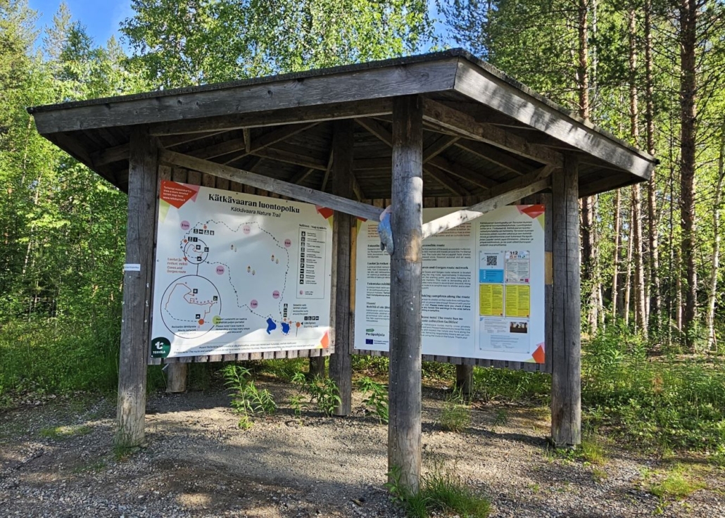 Kemin viikonloppu ja kaunis lauantaiaamu. Tein ex tempore-päätöksen käväistä Tervolan Kätkävaaralla. Ajelin siis nelostietä ja käännyin Kätkävaarantielle. Opasteet johdattavat Leirikätkä-nimiselle tielle, josta löytyy todella tilava pysäköintialue. Sen laidassa on muutama opastaulu. Luontopolun kerrotaan olevan seitsemän kilometrin mittainen. Reitillä ei ole polttopuuhuoltoa, joten tulistelupuut kannattaa ottaa mukaan.