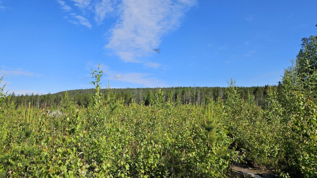 Takana noin kilometri kävelyä, hyvin tasaisissa maisemissa. Nyt käännytään kohti pohjoista, jossa taimikon takana Kätkävaara jo näkyykin. Tuonne oltaisiin nousemassa. Kuvassa taitaa olla keskellä myös hyttynen – niitäkin täällä riitti, jopa harmiksi asti.