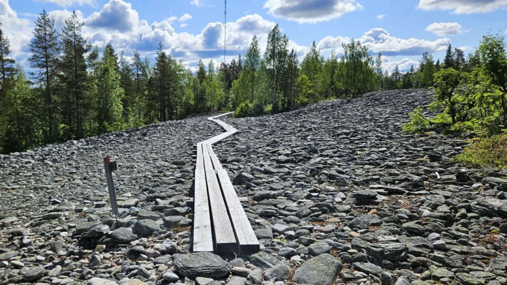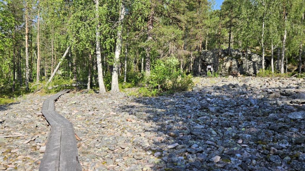 Kohta ollaan jo ensimmäisellä kivikko-osuudella, pitkospuilla. Taustalla näkyvän kallion laidalla on taas taukopaikka. Nousua takana noin 35 metriä, matkaa noin kaksi kilometriä.