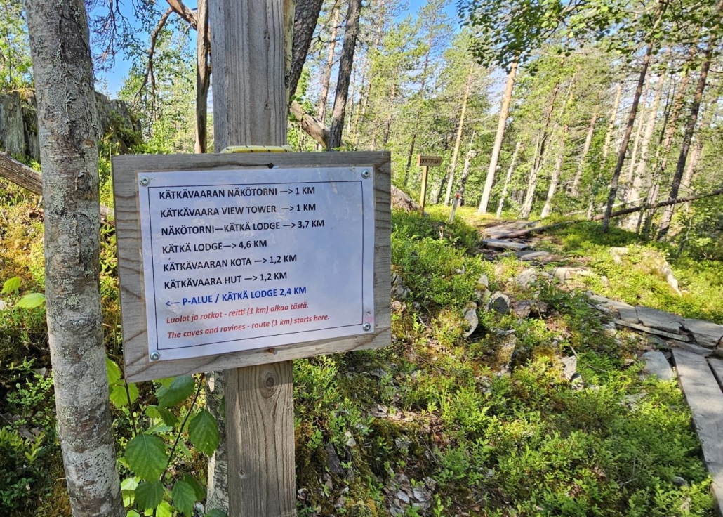 Kohokohdat: Kätkävaaran huippu rakkakivikkoineen ja näkötorneineen. Luolareitti nousun varrella.