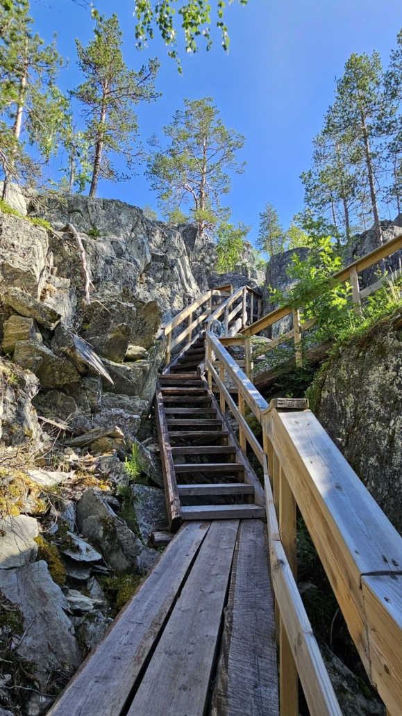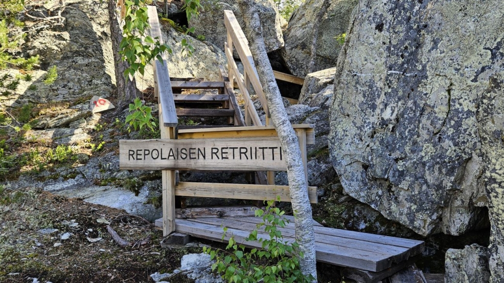 Viimeinen luola taisi olla tämä Repolaisen retriitti. Reittiä kuljetaan siis paljon portaita ja lankkuja pitkin, mutta täällä on aseteltu myös litteitä kiviä astinlaudoiksi. Kaikki eivät ole tiukasti paikallaan, varovaisuus on siis tarpeen. Minulla oli täällä vaellussauva mukana ja siitä oli paljon hyötyä ja tukea. Kiviaskelmia on koko reitin varrella, joten sama varovaisuus mukaan koko seitsemän kilometrin ympyrälle!