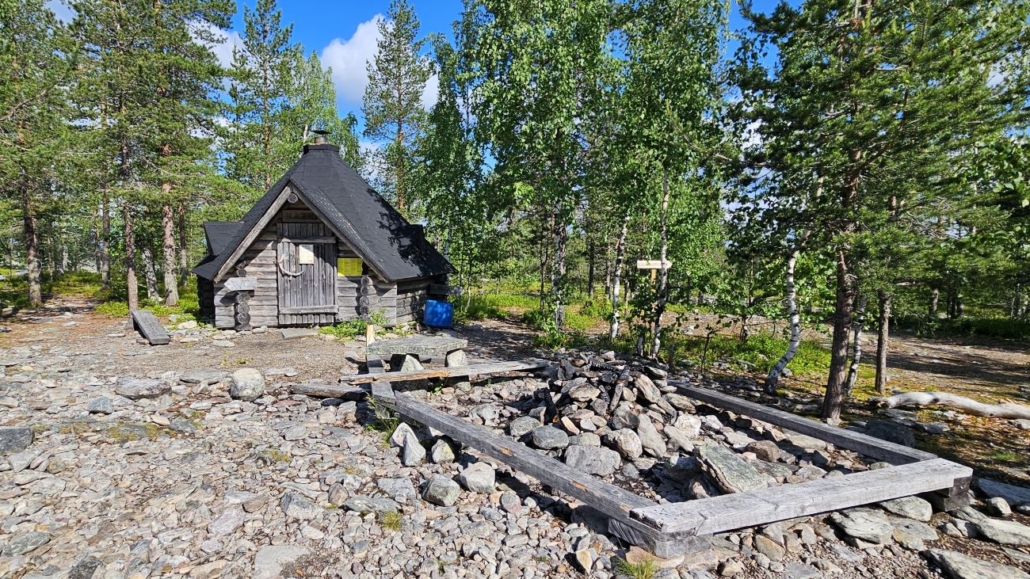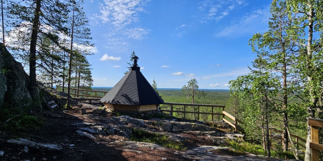 Eikä siinä vielä kaikki. Tällä samalla tasanteella on myös komea taukopaikka – huippumaisemien kera! Maisemat avautuvat tästä länteen. Kodan vieressä on myös piknikpöytä.