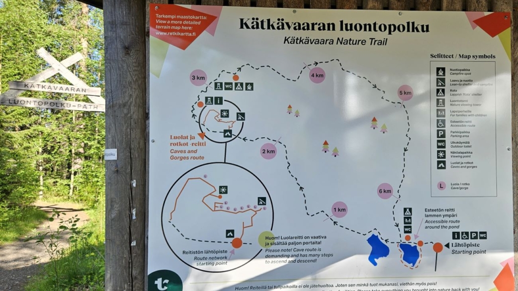 Karttaan luontopolku on merkitty myötäpäivään. Sen varrella on myös uudehko ”Luolat ja rotkot -reitti”, joka on erillinen puoliympyrä kahden ja kolmen kilometrin välissä. Lähtöpisteen lähellä on lyhyt esteetön reitti, joka kiertää lammen ympäri. Luontopolun lähtöportti näkyykin jo kuvassa taulun vasemmalla puolella.