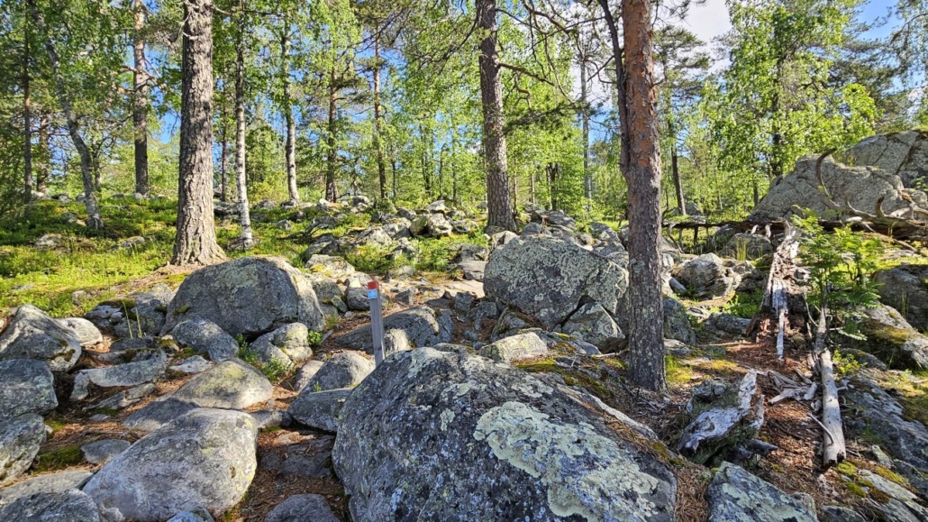 Ja lisää yllätyksiä. Seuraava osuus Kätkävaaran huipun lähellä on tasaista kangasmaastoa. Tämä on siksikin virkistävä poikkeus, että noin kilometrin matkan kävely sujuu ilman jalkoihin katselua – reitti on lähes kivetön.