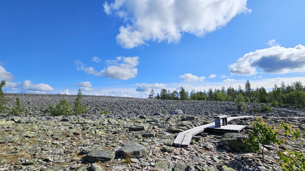 Ja kohta niitä sitten on ihan silmänkantamattomiin. Näkötorni näkyy jo kuvan keskellä pienenä pisteenä. Pitkosreitti vie rakkakivikon yli. Penkissä on myös välimatkamerkintä. Ilmeisesti jäljellä olisi vielä 4 kilometriä kävelyä.