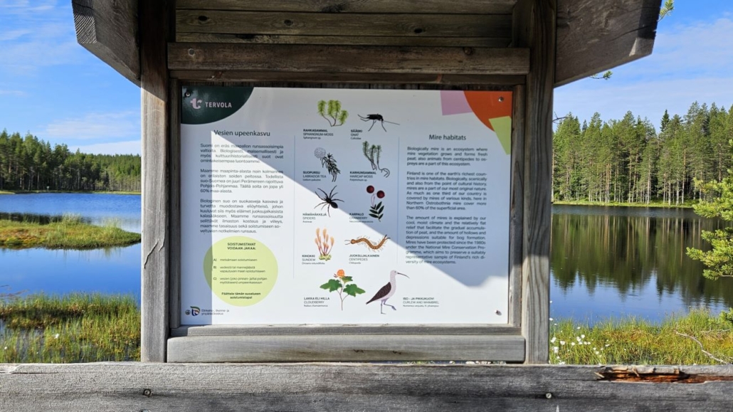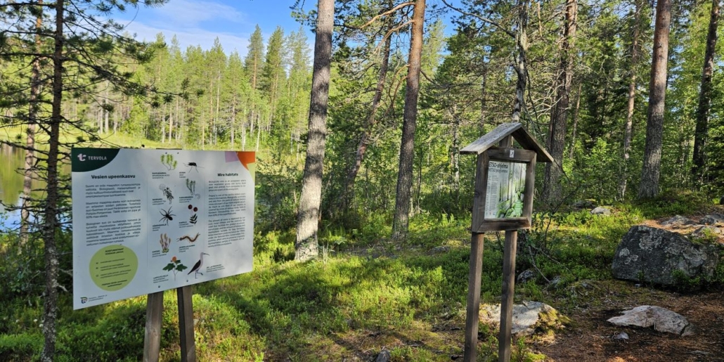 Toisen Perälammin rannalla on luontotaulu – ja tässä vaiheessa vielä ihmettelin, miksi vesien ”upeenkasvu” tuli taas vastaan. Toinen taulu kertoo Metso-luonnonsuojeluohjelmasta. Reitin varrella on sekä uudempia että vanhempia tauluja.