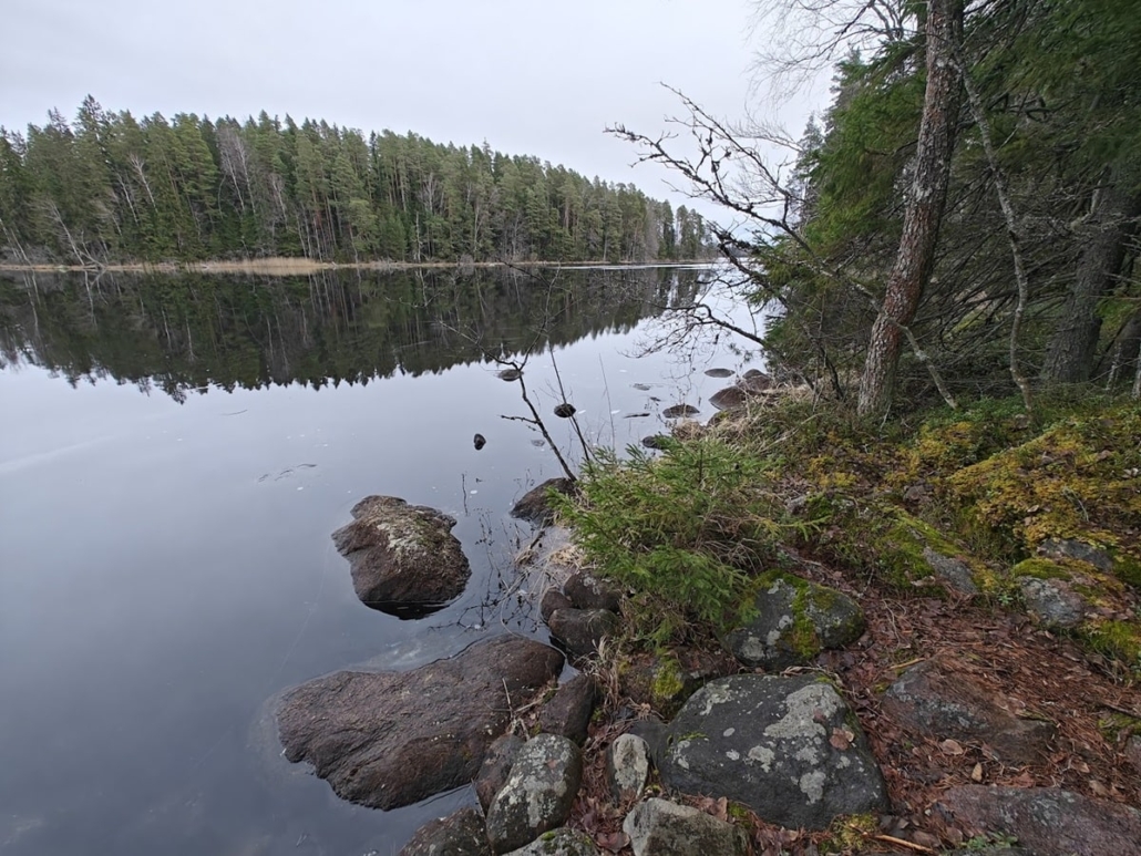 Joulunpyhät, harmaa taivas, lumettomuus ja vain muutaman tunnin kestävä valoisa aika olivat käärineet Liesjärven kansallispuiston täydelliseen rauhaansa, kun saavuimme Korteniemen perinnetilan pihapiiriin joulupäivänä. Kuljimme ensin Ahonnokan luontopolun ja lähdimme käymään vielä Pitkäkärjessä, jotta retkeen tulisi enemmän pituutta. Koko reissumme aikana emme nähneet ketään muuta edes vilaukselta, ja tuntui, kuin puisto vanhoine metsineen ja järvimaisemineen olisi ollut yksityiskäytössämme.