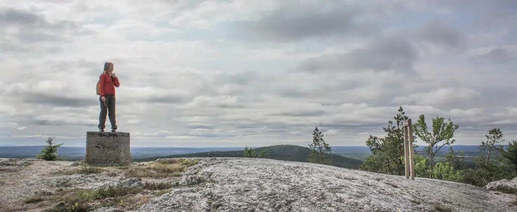 Päivän kirkastuessa Rukan yllä kannattaa kulkijan antaa askeleidensa johdattaa Juhannuskalliolle. Niin mekin teimme, ja vain muutaman askeleen jälkeen tuntui, ettei hiihtokeskuksesta ole kohta jälkeäkään – vaikka seisoimme käytännössä koko komeuden yläpuolella.