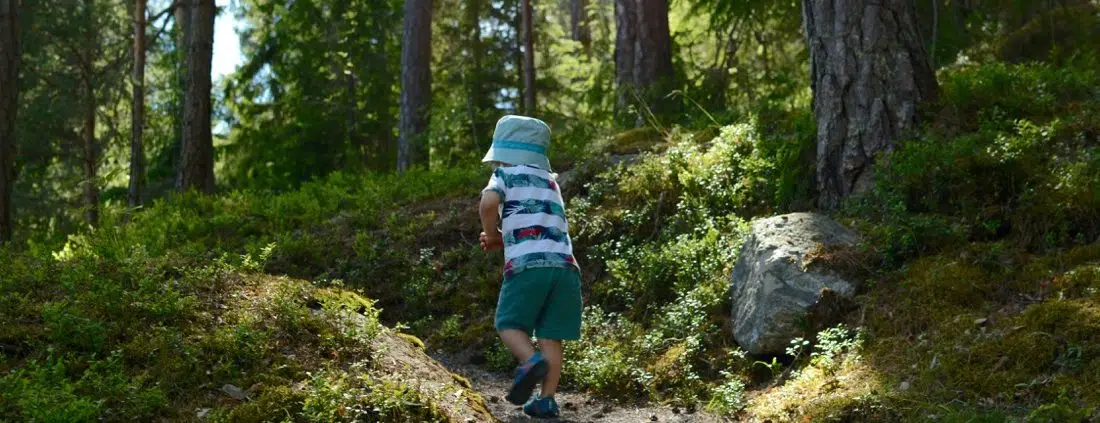 Mäntyjen muhkeat punaruskeat rungot ja metsänpohjan heleänvihreät mustikkamättäät kaappasivat meidät saman tien retkitunnelmiin. Yksi singahti leveää polkua keppihevosellaan, toinen ryhtyi keräämään käpyjä hattuunsa, kolmas katseli hetken metsämaisemaa korkeuksista porukan pisimmän olkapäillä istuen, neljäs oli jo nukahtanut kantoliinaan.