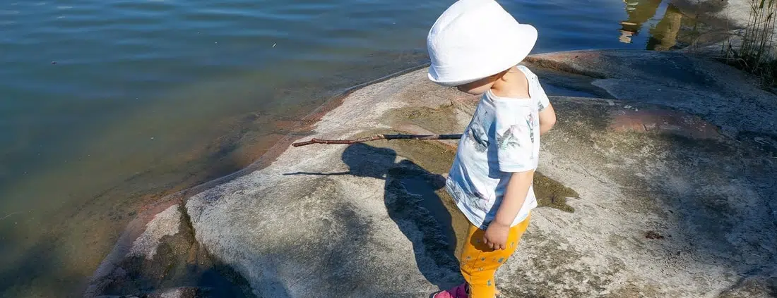 Vastakkaiselta rannalta löytyikin sitten sopiva kallio eväiden syöntiin. Kallioilta oli mukava tähystellä merelle. Oikealla meni laivareitti, jossa harvakseltaan liikkui moottoriveneitä. Toisessa suunnassa lahden pohjukassa näkyi joutsenpariskunta, joita lapset tykkäsivät tähytä kiikareilla. Rannasta löytyi myös muuta kiinnostavaa tutkittavaa. Isompi lapsi huusi yhtäkkiä äitiä katsomaan jotain tärkeää asiaa meressä, ja toden totta: rantavedessä uiskenteli ihmeellinen noin 20 senttimetriä pitkä nauhamainen kala! Kala piti ikään kuin pyrstöllään pohjasta kiinni ja huojui veden mukana. Minulle tuli mieleen vain merihevonen. Ystäväni selvitti retken jälkeen, että kyseessä täytyi olla siloneula! Eipäs ollut kukaan nähty semmoista kalaa ennen!