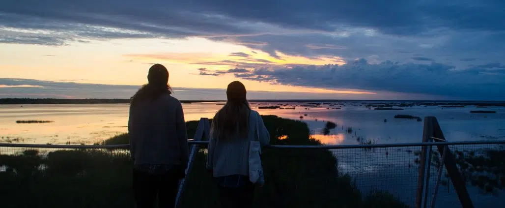 Näky oli vaikuttava. Laajalle levittyvä kosteikkoalue, jonka pystyi kuvittelemaan kuhisemassa kevätmuuttajia. Tyyni veden pinta heijasti auringonlaskun kaikki värisävyt peilin lailla. Tuijotimme näkyä mykistyneinä.