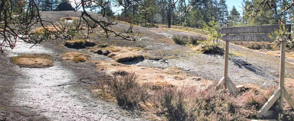 Varjoisat kohdat ovat vielä jäässä polulla, mutta kohta olen taas Metsähallituksen punaisella nauhalla tehdyllä viitoituksella. Kallio kohoaa äkkijyrkissä 5 metrin pykälissä ylös, ja polku on hakeutunut tuhansien jalkaparien ohjaamana helppokulkuisimpiin kohtiin. Näyttää kuin askeleet olisivat kuluttaneet polun graniittikalliot sileiksi. Askelletaan silti huoleti, sillä kuluminen on tapahtunut jo mannerjään toimesta kymmeniä vuosituhansia sitten.
