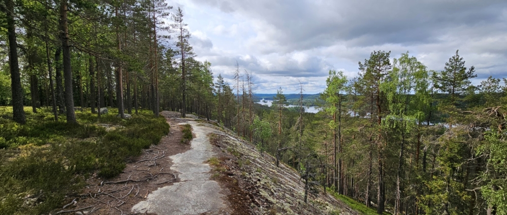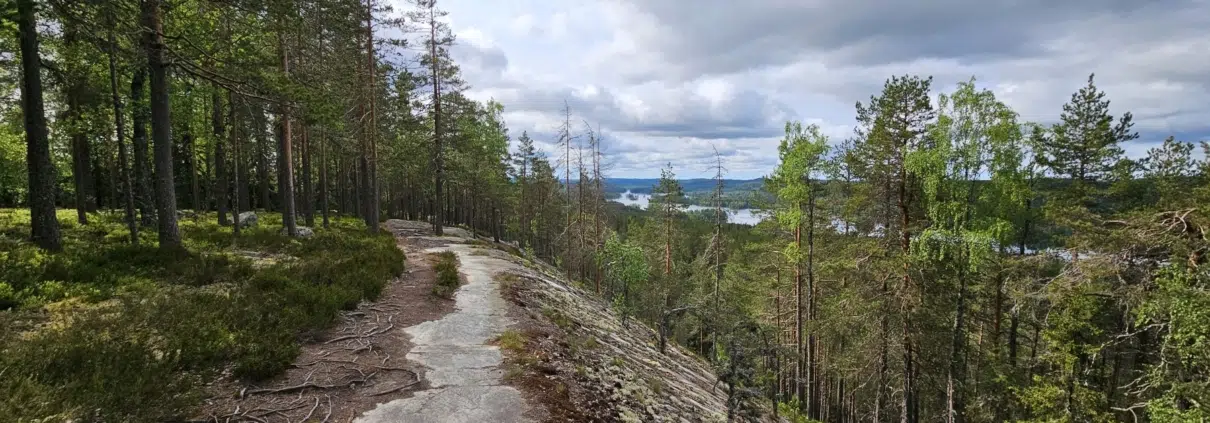 Nousin rauhallisesti mäkeä ylös ja katselin myös maisemia vasemmalle ja oikealle nousun varrella. Paras maisemapaikka on vasta hieman reitin korkeimman kohdan jälkeen. Avokallio alkaa jo näkyä.