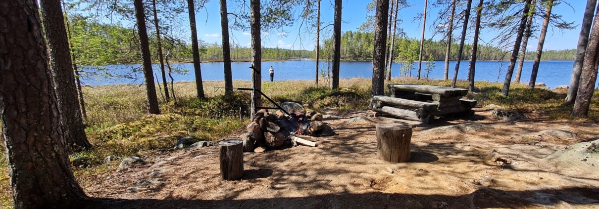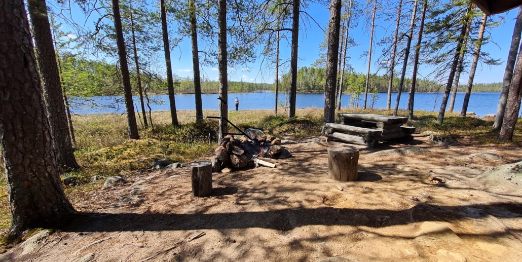 Parinsadan metrin päässä on reitin ensimmäinen tulipaikka, Porojärvi. Retkikaverin kanssa päätimme jatkaa matkaa Juolungansalmen laavulle, jossa ajattelimme paistaa makkarat ja pitää vähän pidemmän lounastauon.