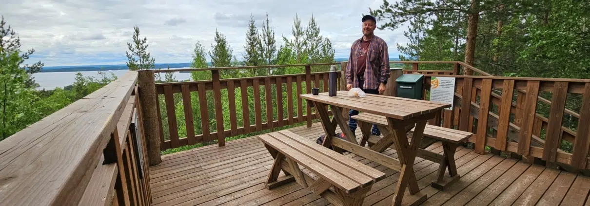 Oli rauhallista, joten päätin pitää evästaukoni täällä tornissa, jossa oli tosiaan piknikpöytä retkeilijän taukoa varten. Selkä oli märkä kovan nousun jälkeen – oli mukava ottaa reppu hetkeksi pois ja istahtaa kahville.