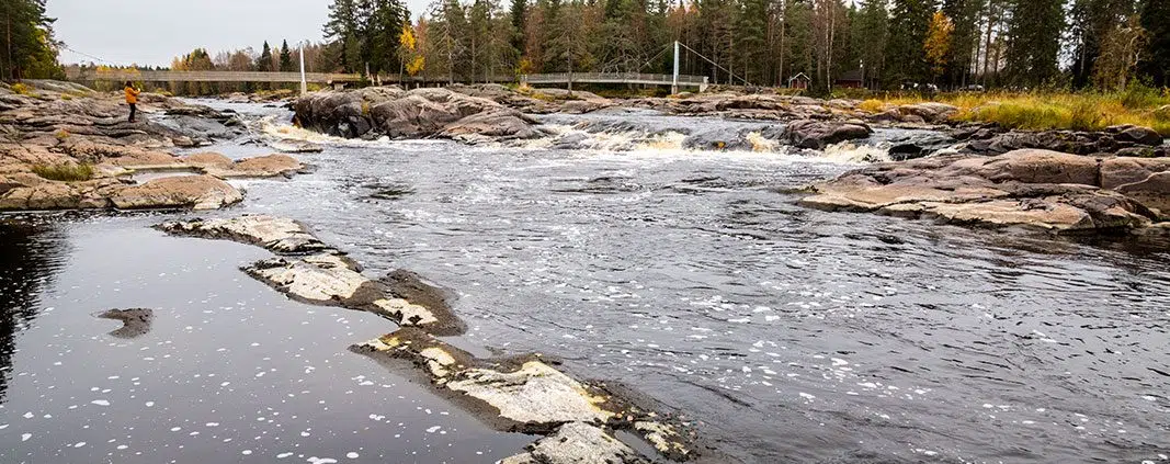 Alueelta löytyy residenssiä, riippusiltaa, esiintymislava, tulentekopaikkoja, esteettömiä pitkospuita ja niin edelleen. Tämä on kyllä loistava ulkoilmaolohuone. Kyllähän paikka oli käytössäkin. Koskella oli monia perheitä lapsineen, koskenlaskijoita ja kalastajia.