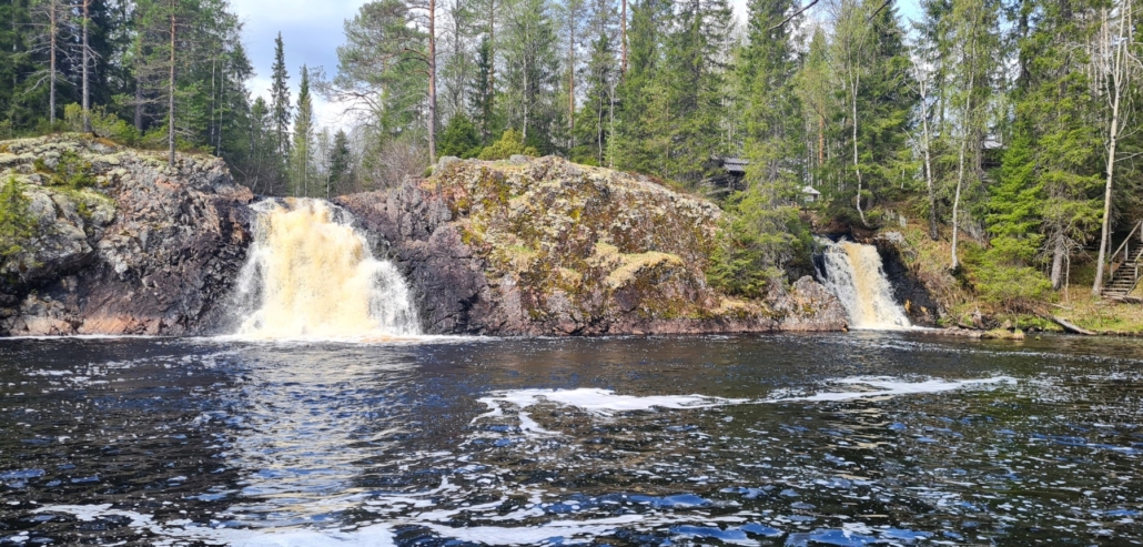 Se näyttää komealta. Putoukset ovat siis noin kuusi metriä korkeita. Ilmeisesti tätä lähempää eli pohjoisempaa uomaa on joskus louhittu, luultavasti sen päällä sijaitsevan myllyn takia.